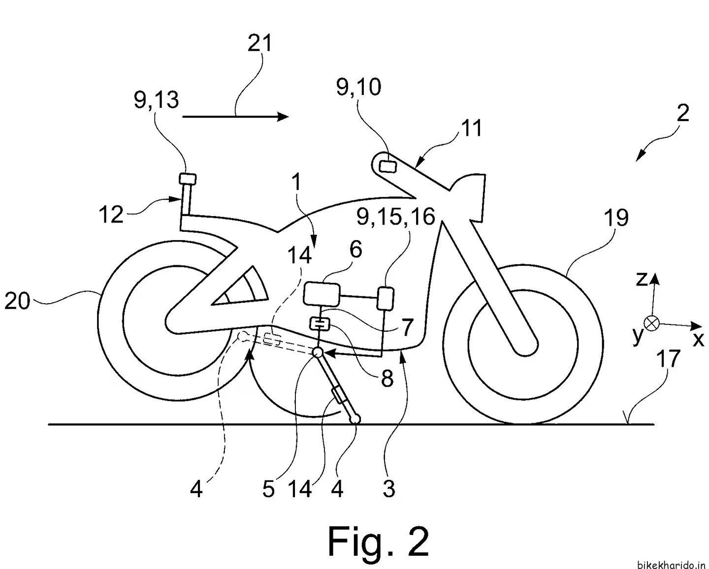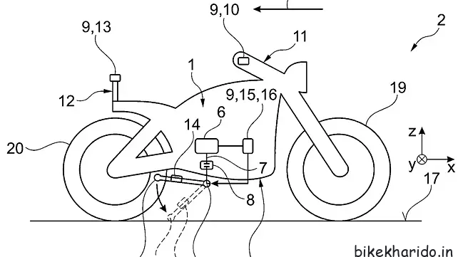 The patent showcases a naked bike with a mid-mounted motor and a battery pack placed diagonally where the conventional engine would be. This position of the battery pack should also assist with the cooling of the same.